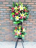 コストを抑えつつ、見映えのする2段構成で、贈る側の丁寧な気持ちをしっかりと届けられるスタンド花です。